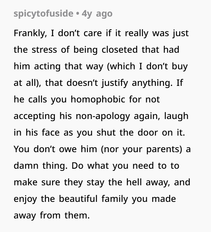 And as for the accusations of being homophobic – I’m not. I don’t care who my brother loves. But what I care about is how he treated me and how my family has treated me my whole life. I’m not going to fall for their manipulative games, no matter how much they want me to.