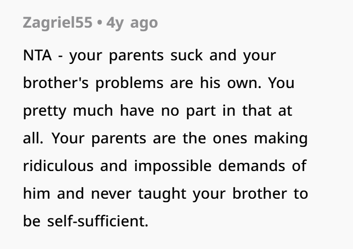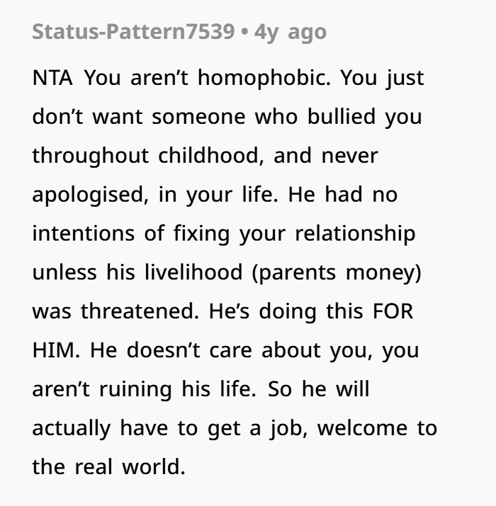 Plus, let’s be real here – I’m not some backup option. My parents want me to act as if my brother’s entire identity hinges on me accepting him. It’s like I’m supposed to make everything okay just because he’s finally come out. But where was he when I needed support growing up? Where was he when my parents were treating me like garbage? He never once stood up for me. Now that he’s in trouble with them, he wants to act like we’re all going to just forget the years of bad blood.