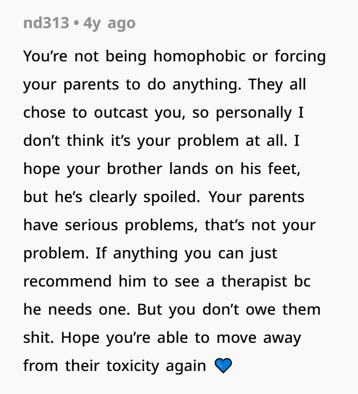 So here I am, questioning if I’m being unreasonable. Am I wrong for not wanting to reconnect with a family that has hurt me so much in the past? And am I the a-hole for not being there for my brother, just because he came out?