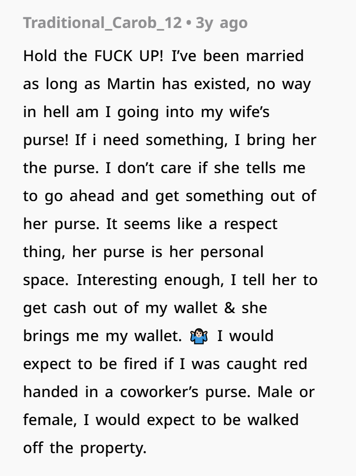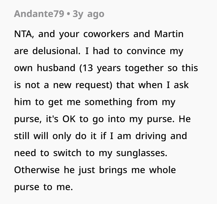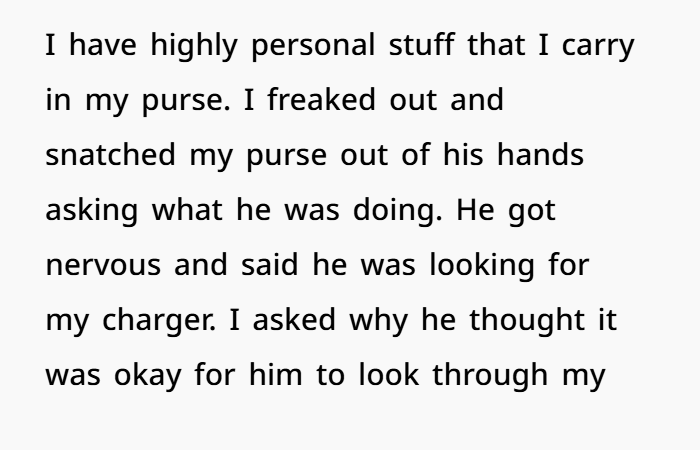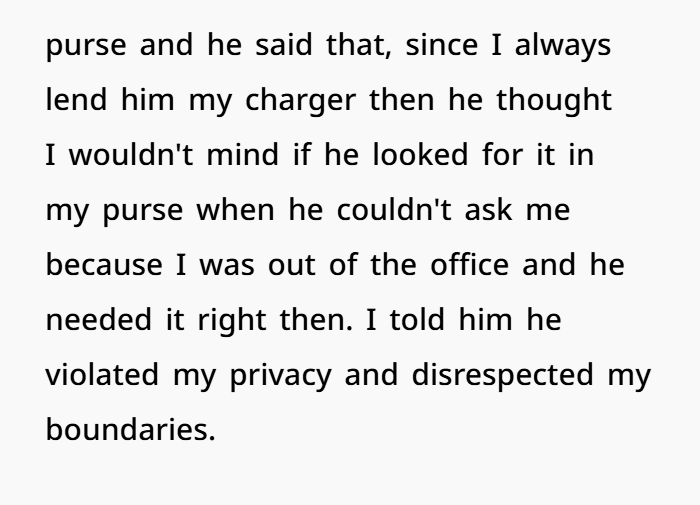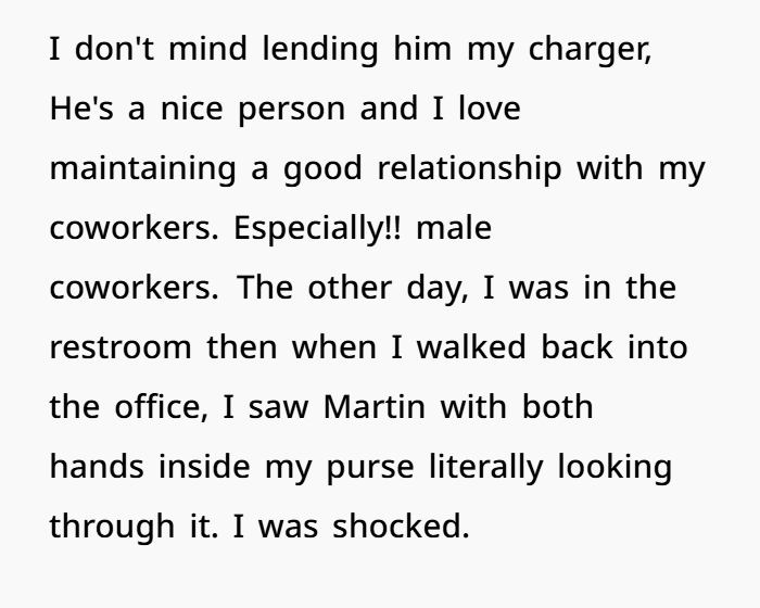 Then one day, I walked back from the restroom and saw Martin with both hands inside my purse, going through it. I froze. I have personal things in there. I snatched it back and asked what the hell he was doing. He stuttered and said he was looking for my charger — since I often lend it, he assumed it was okay to dig around while I wasn’t around. I told him that was a violation of my privacy and that he disrespected boundaries.