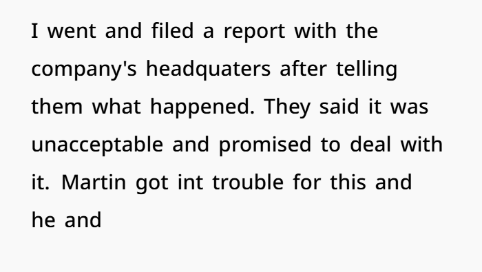 I went ahead and filed a report with HR / corporate headquarters. The higher-ups said it was unacceptable and that they would deal with it. But now Martin got in trouble. Some coworkers are upset, saying I overreacted, “stop being dramatic,” etc. A female coworker told me to “get over myself” and “stop pulling victim card.”