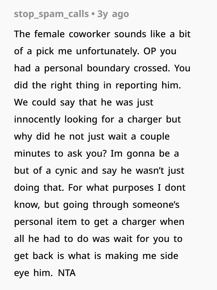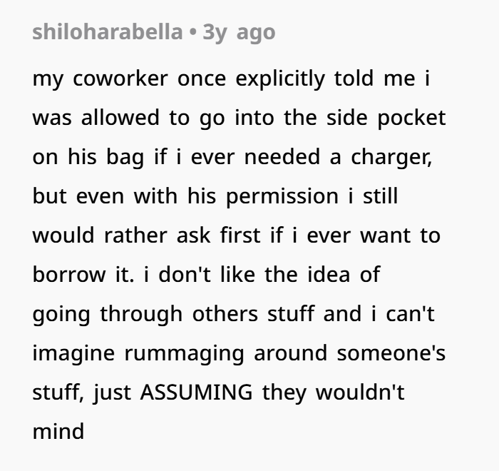 It’s easy to brush something like this off: “Oh, it’s just a charger,” “he meant no harm.” But privacy is rarely about big dramatic acts only. Small boundary violations accumulate. When someone assumes they have access to your personal space (your bag, your belongings) without asking, it undermines autonomy, respect, and psychological safety.