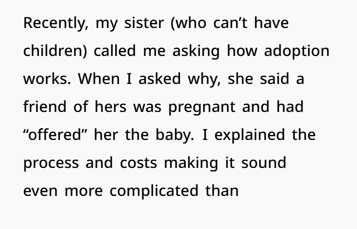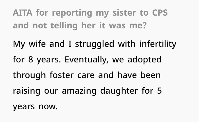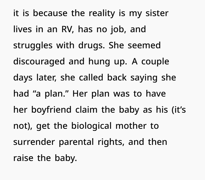 OP and his wife spent nearly a decade facing infertility before adopting a child through the foster care system—so they know firsthand the emotional depth and legal complexity of adoption. When OP’s sister—who also can’t have kids—called asking about how to adopt, red flags immediately went up. She lives in an RV, has no job, struggles with drug use, and has a history of unstable behavior.