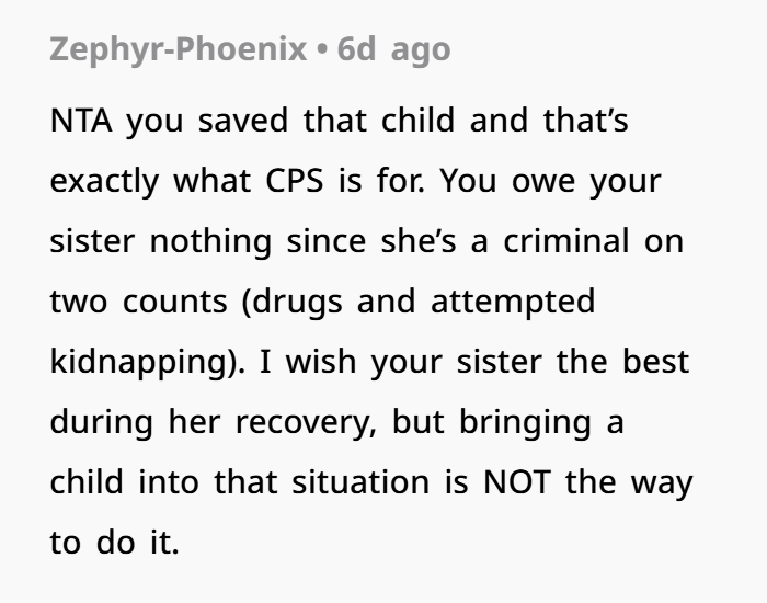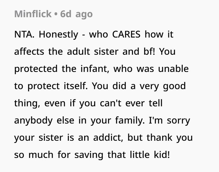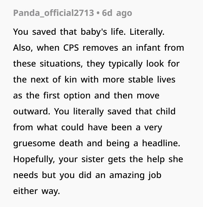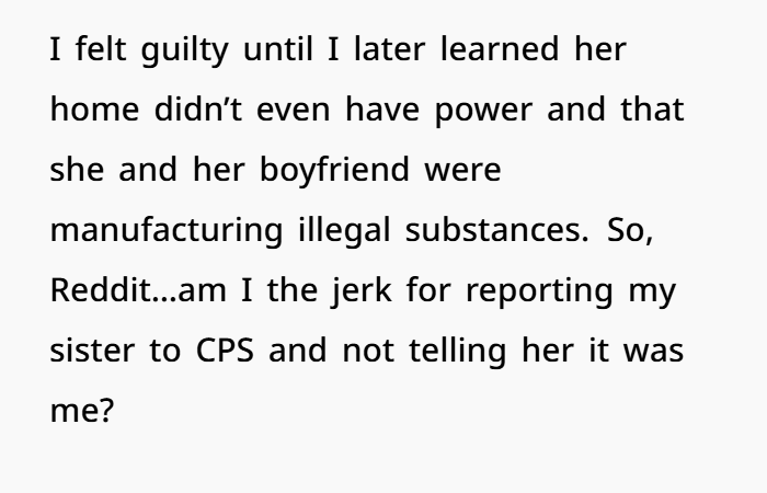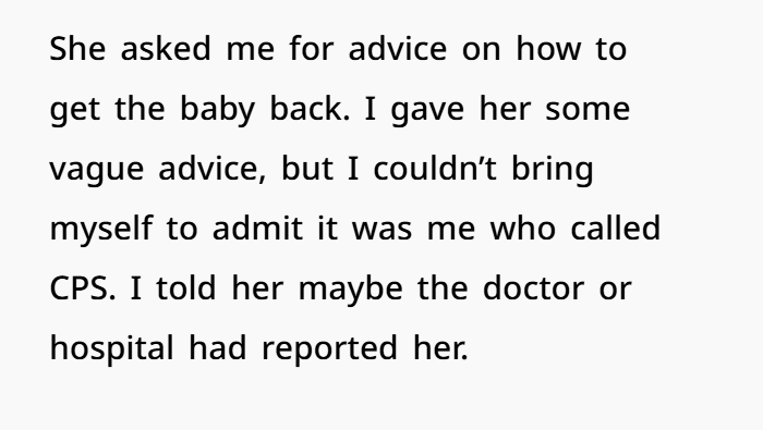 Fearing for the safety of the unborn child, OP anonymously contacted CPS. When the baby was born, CPS intervened immediately. The sister, heartbroken and confused, turned to OP for support. He offered vague advice but didn’t reveal that he was the one who made the call.