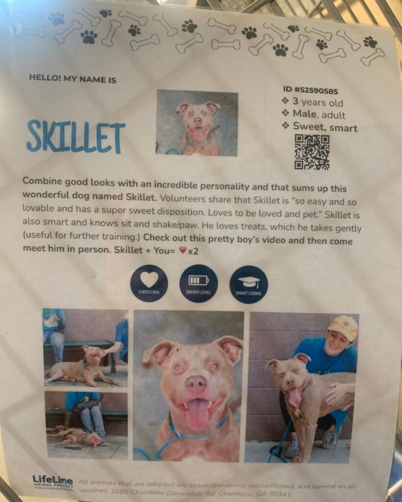 Back then, nobody knew his real name — they called him Skillet. And even though he didn’t have a forever family yet, he made sure to spread happiness around the shelter. The staff adored him for his friendly nature, goofy energy, and that tail that never stopped wagging.