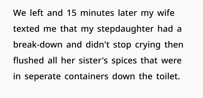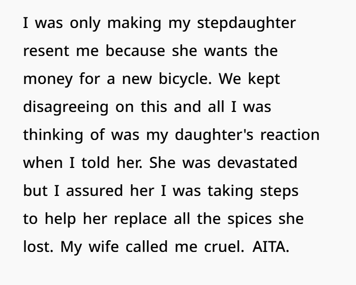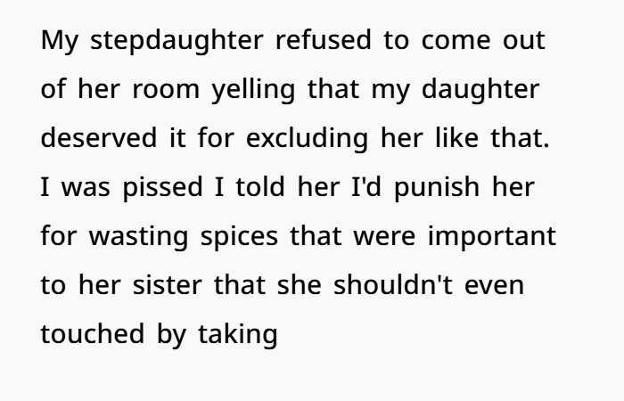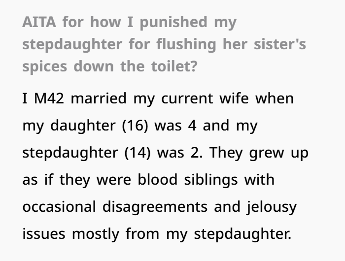 In a fit of rage, the stepdaughter flushed her sister’s entire spice collection down the toilet—spices that were not only expensive but also held sentimental value as a gift from an Asian friend’s mother. The father was furious and decided the punishment should be financial: his stepdaughter would pay for the lost spices using her savings. His wife, however, strongly objected, saying she expected a grounding or privilege removal—not taking the money her daughter had saved for a bike. She even went as far as to say the real blame lay with the older daughter for “excluding” her stepsister.