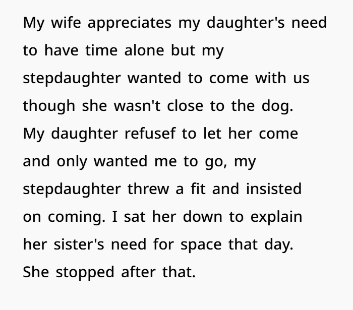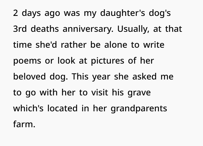 In this emotional AITA post, a 42-year-old father finds himself in hot water after enforcing what he thought was a fair punishment for his stepdaughter’s destructive actions. His 16-year-old daughter and 14-year-old stepdaughter have grown up like sisters, but there’s a history of jealousy—mostly coming from the younger girl. When the anniversary of his daughter’s dog’s death came around, the grieving teen wanted a quiet trip to the dog’s grave with just her dad. The stepdaughter wasn’t invited and didn’t take it well.