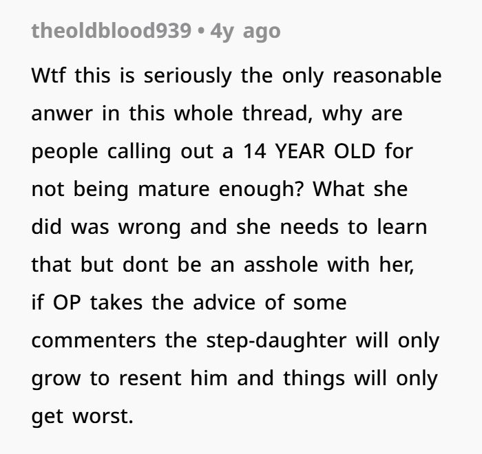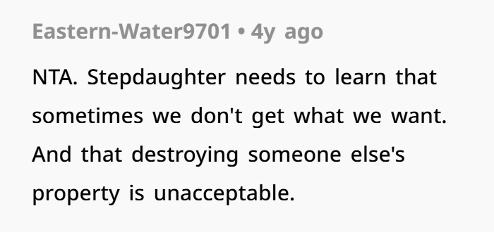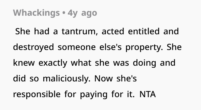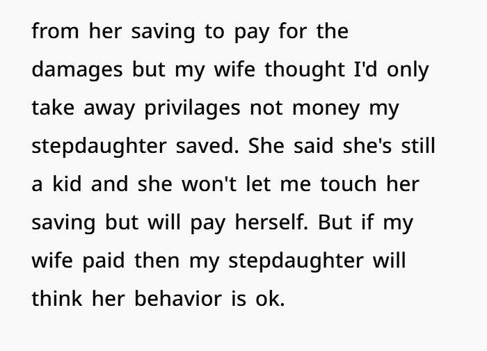 Despite being called “cruel” by his wife, the OP stands firm. He believes a financial consequence fits the crime and wants to make sure the stepdaughter understands the seriousness of her actions. But now he’s wondering—AITA for making her pay up?