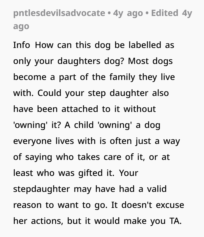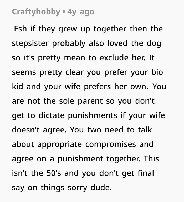 Let’s not ignore the bigger elephant in the room: blended family dynamics. The stepdaughter seems to have a long-standing pattern of jealousy, and unfortunately, the mother appears to enable it—defending the behavior and even shifting blame onto the victim (the daughter who was grieving her pet).
