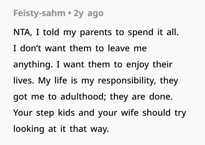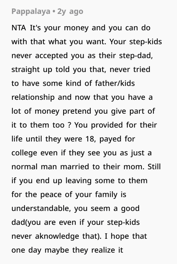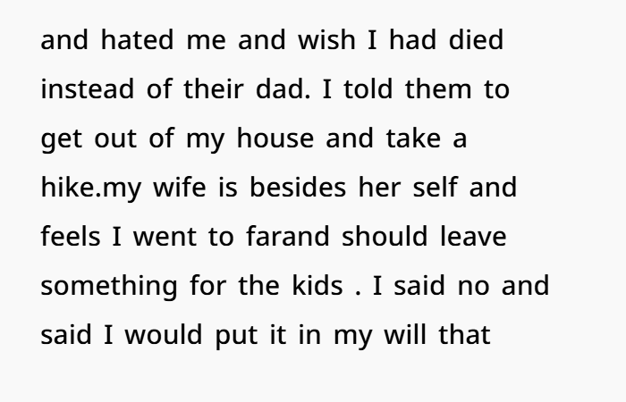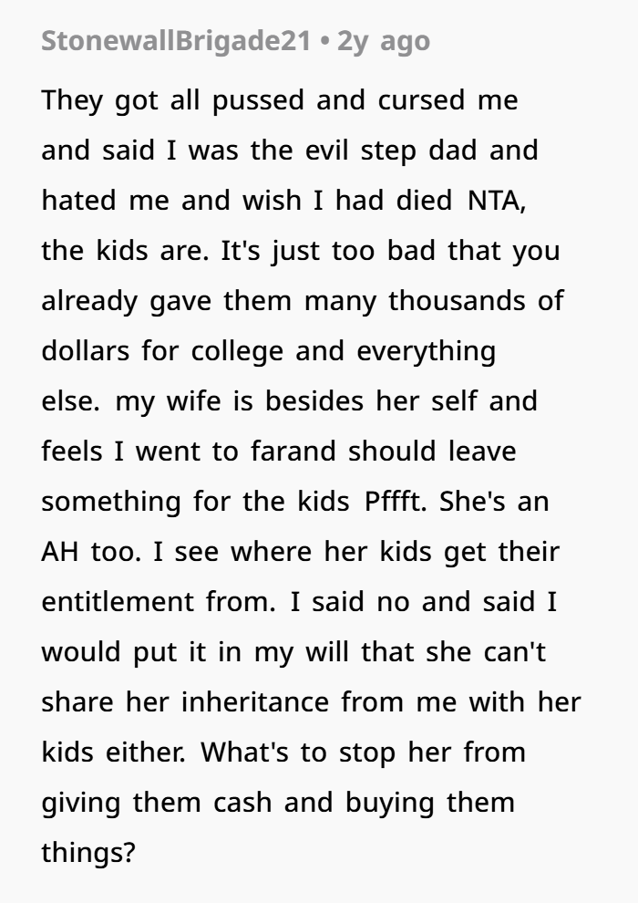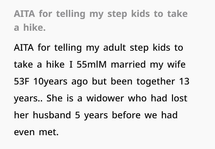 OP snapped. He told them to get out of his house and “take a hike.” Now his wife is upset, not speaking to him, and saying he’s gone too far. He’s holding his ground—not only refusing to leave anything to the stepkids, but also changing his will to ensure they can’t get anything through her either.