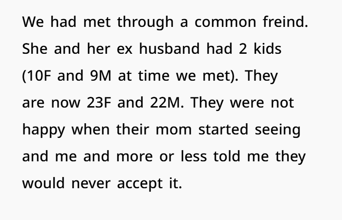 When the poster married his current wife, she was a widow, and even after 13 years, her two kids don’t accept or respect him