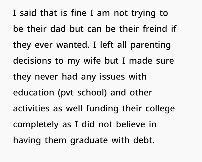 OP gave them education, stability, and a shot at a debt-free life. That’s more than many biological fathers do. If that’s not enough for them? That’s on them—not him.