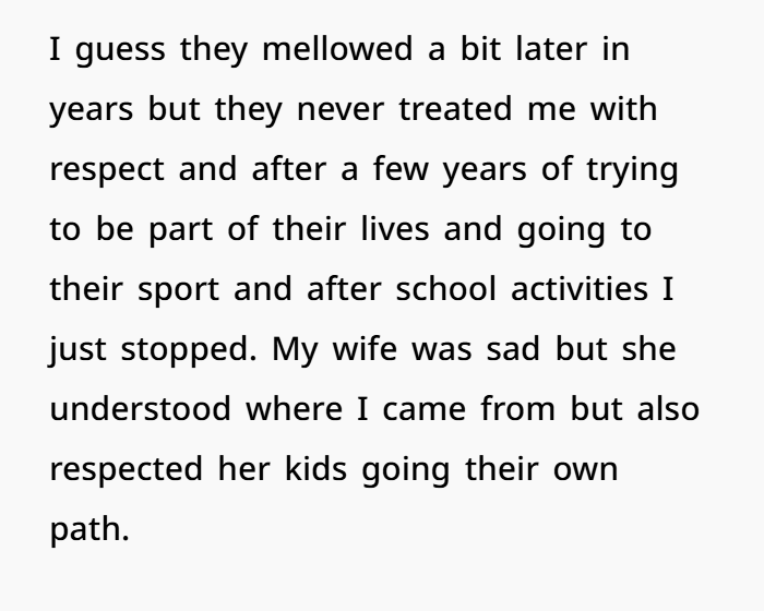 This post hits on a painful truth that many stepparents face: you do all the right things—support, provide, respect boundaries—but still never earn a place at the table. OP didn’t try to replace their dad. He gave them space. Still, they dismissed him for over a decade. And yet—he fully funded their education, which in the U.S. could easily be $200,000+ for two kids. That’s more than some biological parents can or will ever provide.