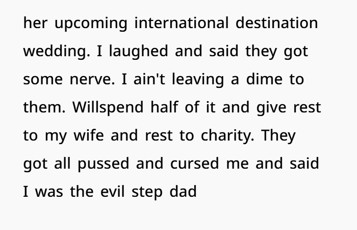 The moment OP said no, the insults started flying: “You’re evil. You never loved us. You hate us.” But here’s the thing—he never claimed to love them like a father. He offered friendship and support. He showed up financially, even after years of emotional distance. And still, they cut him down when they didn’t get what they wanted.