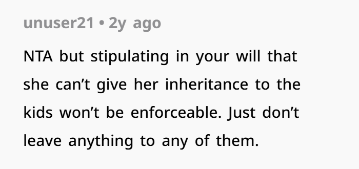 Here’s where things get tricky. OP not only plans to leave them nothing—but also wants to block his wife from sharing her own inheritance with them. That’s a bold move. Maybe too bold?