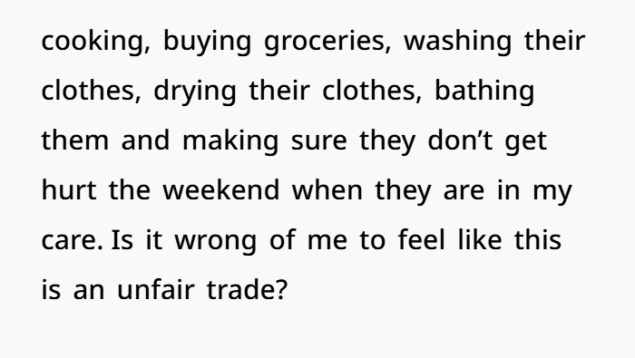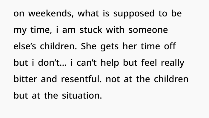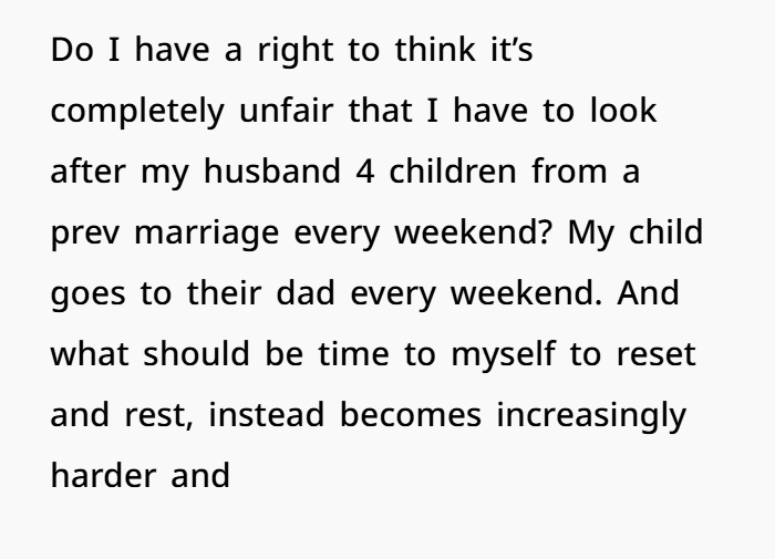 The poster explained that she used to get free time when her kid went to her dad’s home every weekend, but now she feels forced to babysit her stepkids