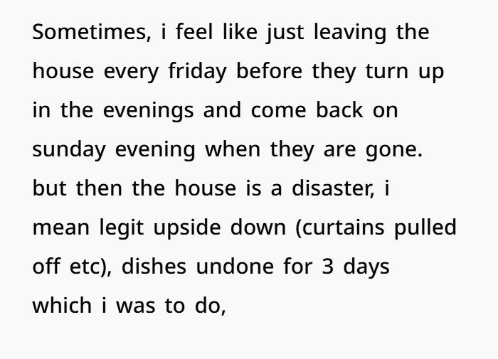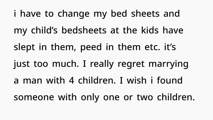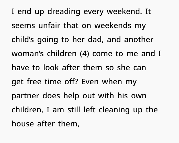 The twist? Her own child goes to their dad’s house every weekend. So while her ex’s partner gets that “off‑duty parent” time, she spends her supposed downtime caring for someone else’s four kids. The resentment isn’t toward the kids themselves—she even emphasizes that—but toward the situation: the imbalance, the exhaustion, and the feeling that she’s lost any time for herself. She’s even fantasizing about leaving the house every Friday and returning Sunday night, just to escape. But doing so leaves chaos behind—a trashed house, laundry, dishes, even soiled bedsheets—and she feels like there’s no winning.