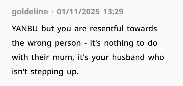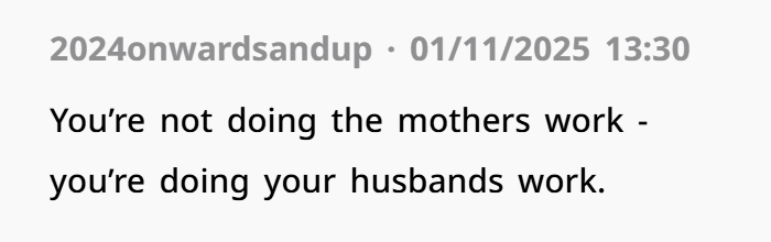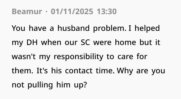 And that’s what you’re describing. Every weekend, you go from a parent who deserves downtime to what sounds like an unpaid, unappreciated caregiver for someone else’s household. That’s not partnership—that’s emotional labor overload.