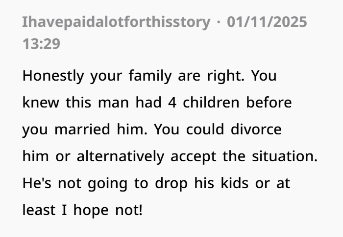 It’s a subtle kind of emotional gaslighting—minimizing your stress by implying you should’ve expected it. But relationships evolve. Circumstances shift. Maybe when you married him, you assumed the parenting would be more evenly distributed or that the kids would be older and more independent by now. Expectations aren’t contracts—they’re hopes.