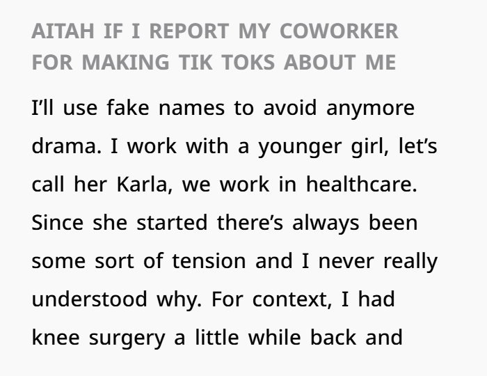 The original poster (OP) shares a deeply personal and emotionally charged experience involving a coworker (referred to as Karla) in a healthcare setting. OP recently returned to work following knee surgery and has certain physical restrictions—restrictions that hadn’t been openly discussed with the rest of the staff. Seemingly out of the blue, OP discovered a TikTok video made by Karla that not only mocks her but essentially doxxes her by showing the back of her car, license plate visible, and implies threats (“slash the bitch’s tires”). Although the video doesn’t mention OP by name, the caption makes it painfully clear who it’s about by using a rhyming name clue.