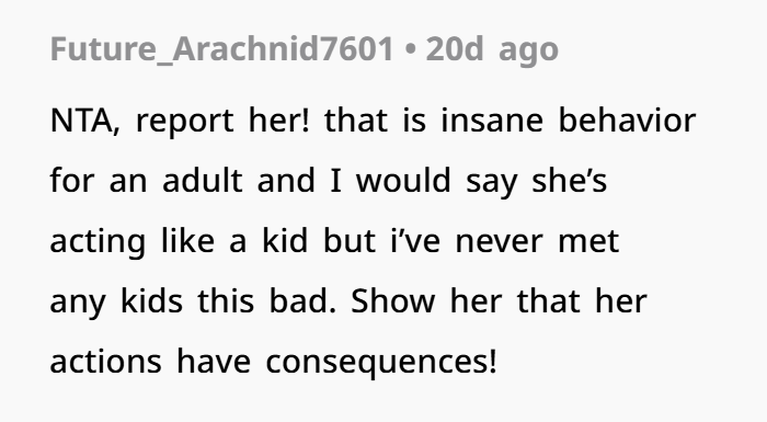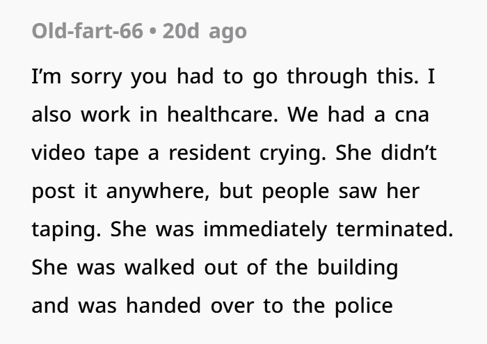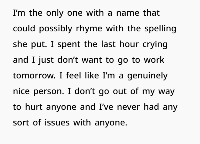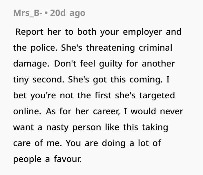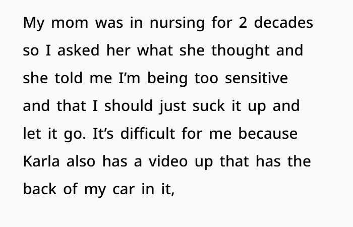 OP is devastated. She describes herself as someone who’s kept to herself, works hard, and avoids conflict. After confiding in her mother, a long-time nurse, OP is told to let it go. But the harassment, the potential doxxing, and the fear of retaliation leave her feeling unsafe and disrespected. Despite the emotional toll, she’s grappling with guilt—guilt that reporting Karla could cost her job, even though she recognizes the seriousness of what’s been done.