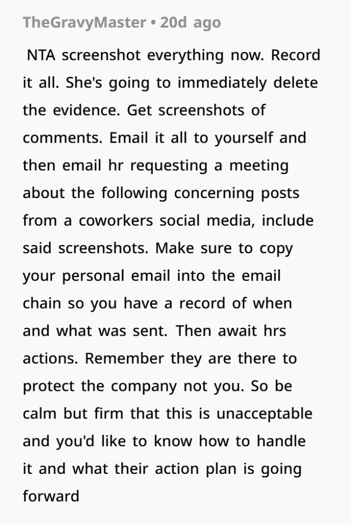 - Check Your Employer’s Social Media Policy. Most HR handbooks include guidelines about online behavior, especially involving coworkers. If hers violates it, it gives HR clearer grounds.