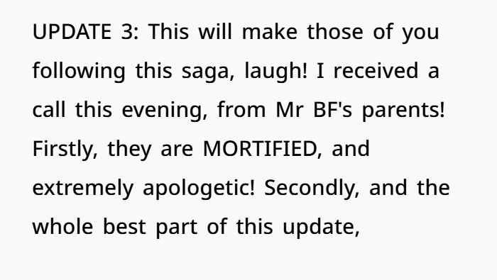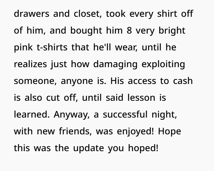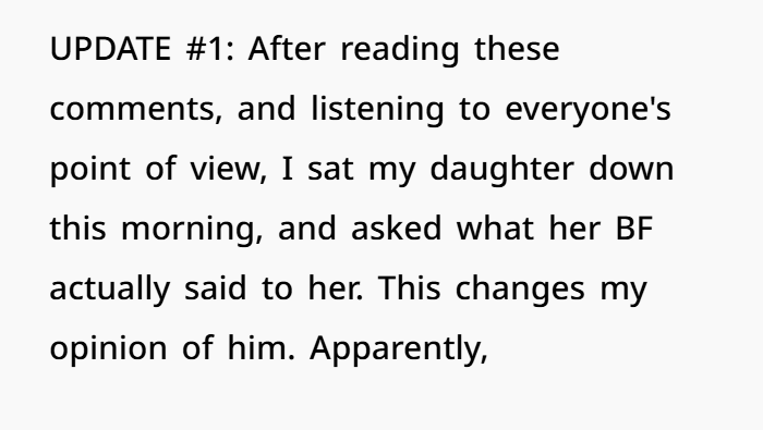 After all was said and done, the boyfriend did exactly what was asked of him. He went to the store, bought a new shirt, and returned without complaint. He didn’t argue or resist the dad’s request, which could have been a sign of growth. The fact that he was willing to apologize in person, explain the situation to his parents, and even offer the dad money for the shirt shows that he wasn’t completely stubborn. Maybe he was a little embarrassed at first, but ultimately, he came to understand that his actions weren’t okay.