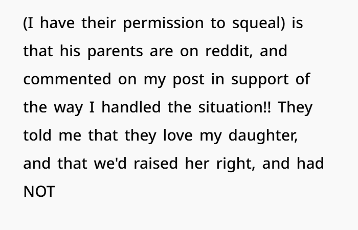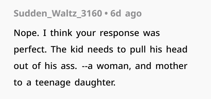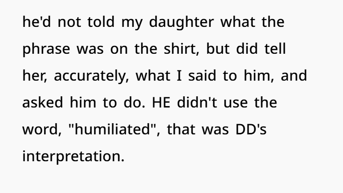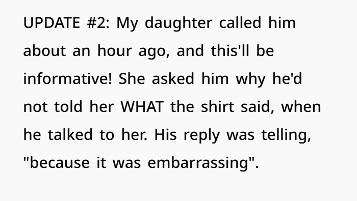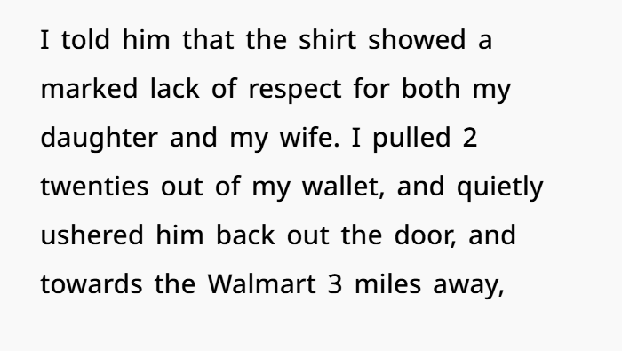 Fast forward a few days, and the boyfriend’s parents got involved. They were mortified to hear about the shirt incident and were incredibly apologetic. In fact, they even reached out to the dad, expressing their support for how he handled the situation. They even went as far as to comment on the dad’s Reddit post, agreeing that their son had shown a lack of respect, and they were proud of the way the dad had addressed it. They were so grateful for the quiet, constructive way the father dealt with the situation, teaching their son without anger or humiliation. The boyfriend, on the other hand, ended up having to explain the situation to his parents and apologize.
