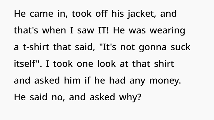That’s what happened when a father, a 57-year-old truck driver, found himself in an uncomfortable situation. His daughter’s boyfriend—19 years old like his daughter—showed up at their house for dinner, wearing a shirt that read, “It’s not gonna suck itself.” As you can imagine, this t-shirt was not exactly the best choice for a family dinner. It was bold, inappropriate, and just screamed disrespect in a setting that should have been about warmth and connection. So, what did the dad do? He did what any father might: he quietly told the boyfriend to leave, go buy a new shirt, and come back when he was dressed more appropriately.
