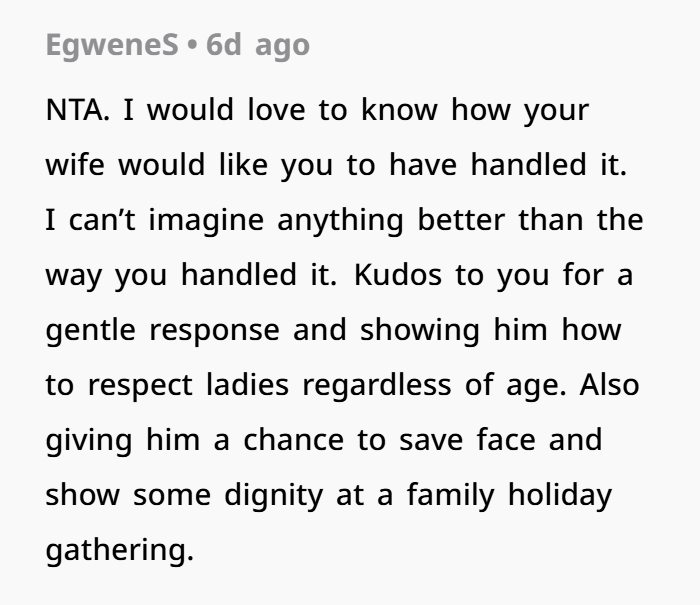 When the boyfriend walked in wearing that inappropriate t-shirt, it could have easily become a big confrontation. A lot of people would have gotten angry, yelled, and maybe even embarrassed the kid in front of the whole family. But the dad, despite the clear disrespect, took a calmer route. He didn’t shout or get aggressive. Instead, he took the kid aside, told him he needed to fix the issue, and gave him the chance to do so without causing a scene. In fact, it’s probably fair to say that this approach was more respectful than the shirt itself.