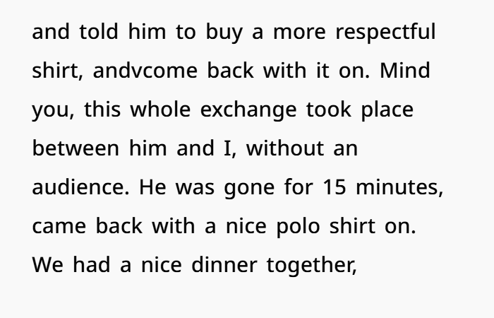 The dad’s actions sparked a huge discussion. Some people thought he was being a little too harsh, while others believed he was simply teaching a valuable lesson in respect. His wife, while agreeing with the general idea, thought that perhaps he could have handled it a bit differently. But here’s the kicker—the boyfriend actually did what he was asked to do. He went to the store, bought a new shirt, and returned for dinner, which ended up going smoothly.
