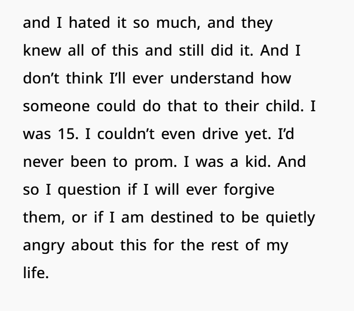 You were fifteen. Your parents pressured you into applying to a selective boarding school—with threats (“if you don’t apply we’ll send you to an all‑girls Catholic school away from your friends”). You applied thinking you’d get rejected, that’d be the end of the threat. Then you got in. They said you only had to go for two weeks and if you hated it you could come home. By day 5 you called to say you wanted to go home—your parents said no, you had to stay the full two weeks. Then, on the day you were supposed to leave, they told you you were staying until graduation. You cried every day for two years, watching your friends move on, your family bring home a puppy two days after you left, your family pretending you chose to be there. You weren’t a bad kid. You were a scared kid. You came home and everything felt changed. You know you’re depressed over what happened. You know the hurt is real. You’re now in college, and you ask: will you ever forgive them? Or are you destined to be quietly angry the rest of your life?