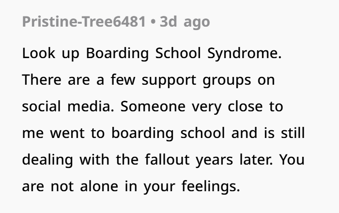 Being placed in a boarding school at 15 against your will is more than a school change. At that age you’re still deeply connected to your home, friends, familiar routines. When your parents took you out of that without your full consent (or with hidden conditions) you suffered a rupture of safety. There’s a concept called “boarding school syndrome” — researchers say children who were separated from parents through boarding arrangements often experience lifelong issues such as difficulty trusting, feeling abandoned, questioning belonging. Caldaclinic