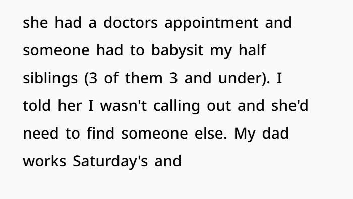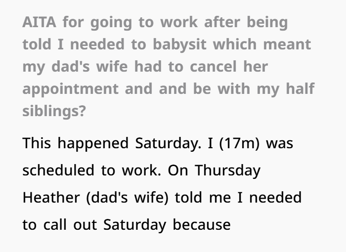 The poster had work on Saturday, yet he was expected to look after his 3 half siblings, as his dad’s wife (Heather) had an appointment