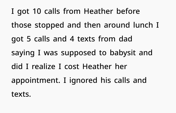 This story centers on a 17-year-old boy caught in a power struggle between his own goals and his father’s idea of family responsibility. OP (Original Poster) had a scheduled shift at work on Saturday, something he’s committed to as part of a bigger plan—saving money to move out and go no contact. But two days before that shift, his stepmom Heather suddenly told him he needed to call out to babysit his three young half-siblings so she could go to a doctor’s appointment. OP refused. He stood his ground and told both Heather and his dad that he wouldn’t miss work for this. Come Saturday morning, Heather expected him to stay—but OP left early, avoided their calls, and chose to protect his job and independence instead.