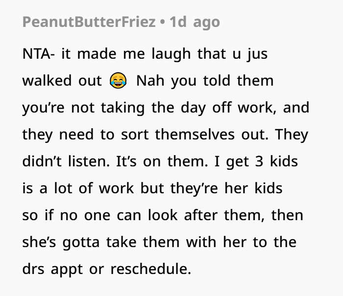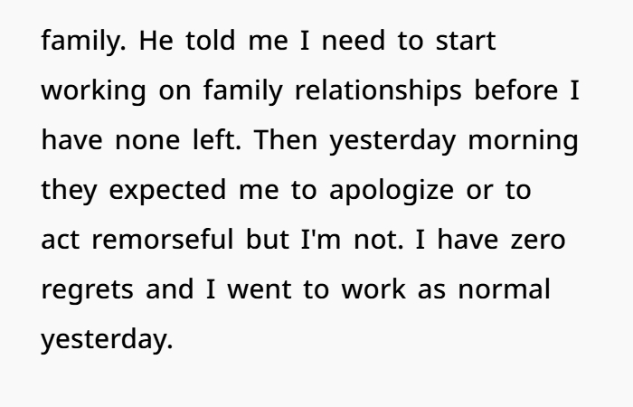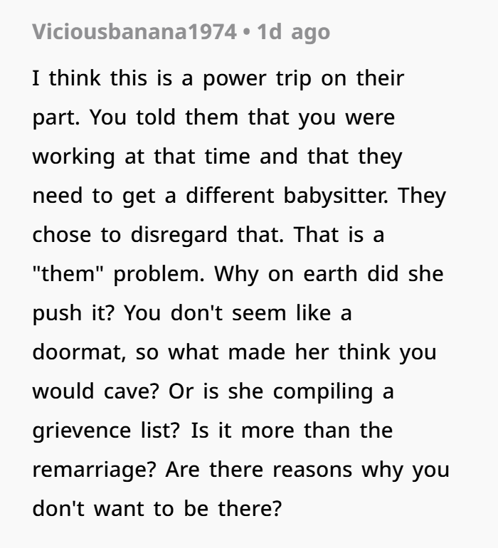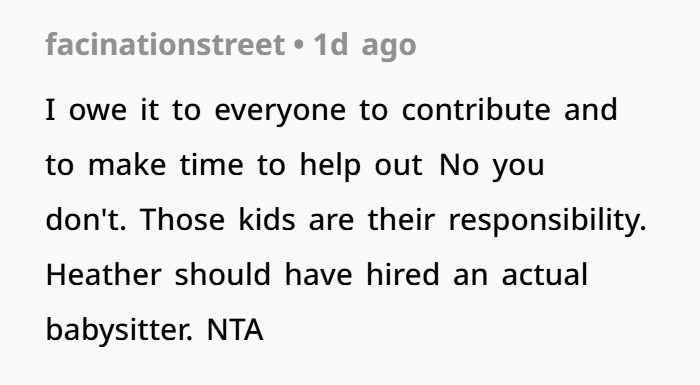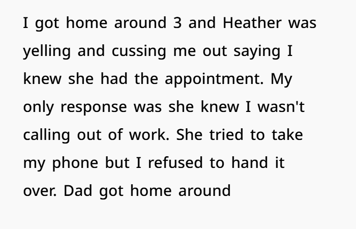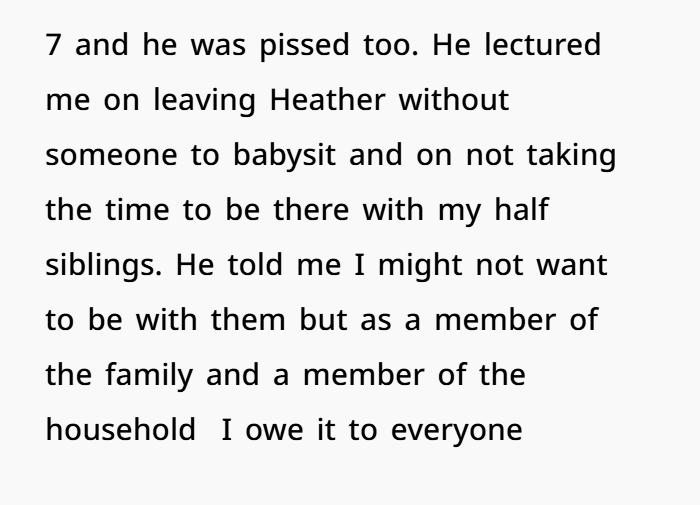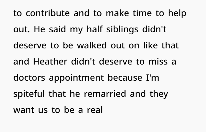 That choice didn’t come without consequences. Heather missed her appointment, his dad unleashed a full-blown lecture, and now OP’s being blamed for damaging family ties. His father claims he’s being selfish and cruel, insisting that helping out with siblings is part of being a “family.” But OP doesn’t feel like part of that family at all. He’s focused on getting out, not bonding with his dad’s new wife or their kids. Now he’s left wondering: Was he wrong to put himself first?