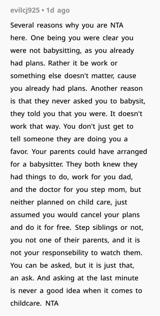 A 17-year-old working, saving money, and staying focused on school? That’s exactly the kind of responsibility parents should encourage. Yet here, he’s being guilted for not prioritizing childcare—childcare that wasn’t even discussed or agreed upon.